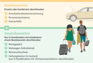 - Noch mehr Schutz für Ihre Reise bieten folgende Zusatzbausteine: «Reisegepäck», «Mietwagen-Selbstbehalt», «Reiserechtsschutz» und «Heilungskosten im Ausland». Diese können Sie in Kombination mit mindestens einem Basisbaustein abschliessen.