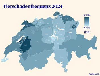 Die Wahrscheinlichkeit, mit einem Tier zusammenzustossen, ist nicht in allen Regionen der Schweiz gleich hoch, wie ein Blick auf die Schadenstatistik der AXA zeigt. Besonders wachsam sollten Autofahrerinnen und Autofahrer in den Kantonen Freiburg, Jura, Thurgau und Schaffhausen sein. Die Schadenfrequenz, also die Anzahl Fälle pro versichertes Auto, bewegt sich dort zwischen 6,9 und 5 Promille. Damit ist das Risiko dort etwa doppelt so hoch wie im Schweizer Durchschnitt (3,2 Promille) und bis zu acht Mal höher als in Basel-Stadt (0,8), wo es am wenigsten Wildunfälle gibt. Auch Nidwalden, Genf (beide 1,2) und Zug (1,8) sind seltener betroffen. «In ländlichen Kantonen gibt es mehr Strassen, die durch Waldabschnitte führen und generell sind mehr Wildtiere unterwegs, was tendenziell häufiger zu Zusammenstössen mit Wildtieren führt», erklärt Michael Villiger, Leiter Schaden Motorfahrzeuge und Mitglied des AXA Kompetenzzentrums Mobilität.