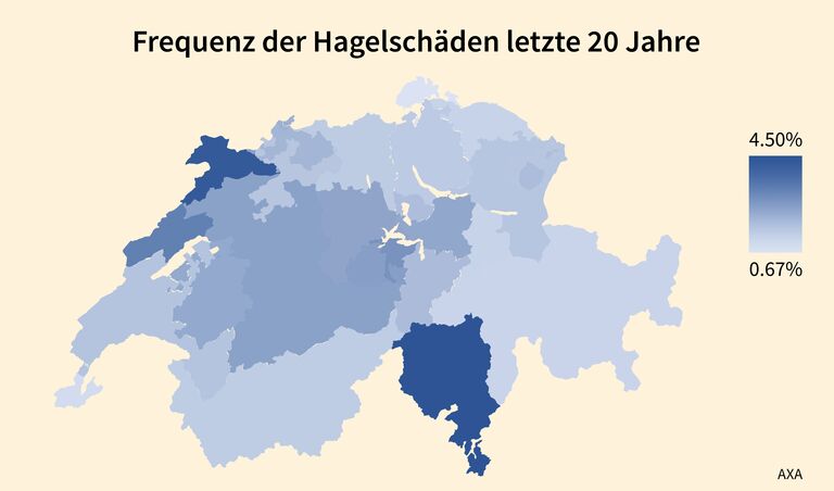 Unwetter, wie sie die Schweiz aktuell erlebt, führen zu zahlreichen Schäden. Letztes Jahr verzeichnete die AXA Unwetterschäden in der Höhe von 132 Millionen Franken, was im langjährigen Schnitt liegt. Einzelne Regionen stechen in der Statistik aber hervor: Hagelschäden an Autos, die den grössten Teil der Unwetterschäden ausmachen, verzeichneten in den letzten zwanzig Jahren besonders die Kantone Tessin, Jura und Neuenburg.