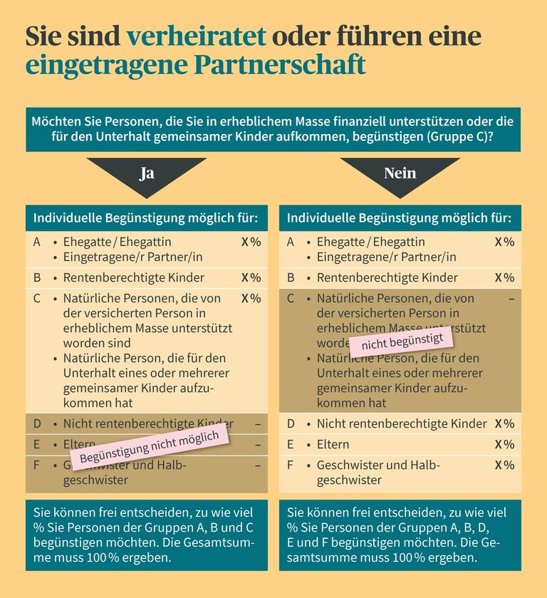 Sie können die im Vorsorgereglement vorgesehene Begünstigungsordnung ändern und individuell an Ihre Lebenssituation anpassen. Das heisst: Sie können im Rahmen des rechtlich zulässigen Spielraums selbst bestimmen, welche Personen wie viel Prozent des Todesfallkapitals erhalten sollen. Je nach Lebenssituation und Familienverhältnissen sind Sie dabei etwas freier oder eingeschränkter.