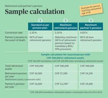 As soon as you retire, you can decide how you want to draw your retirement benefits under the 2nd pillar; in other words, your pension fund benefits. You can decide between a lump-sum payment, a lifelong retirement annuity, or a hybrid form. If a retirement pension in the form of an annuity is chosen, a partner pension amounting to 60 percent of the retirement pension is generally also insured, with this being paid out in accordance with the occupational benefits fund regulations in the event of death.