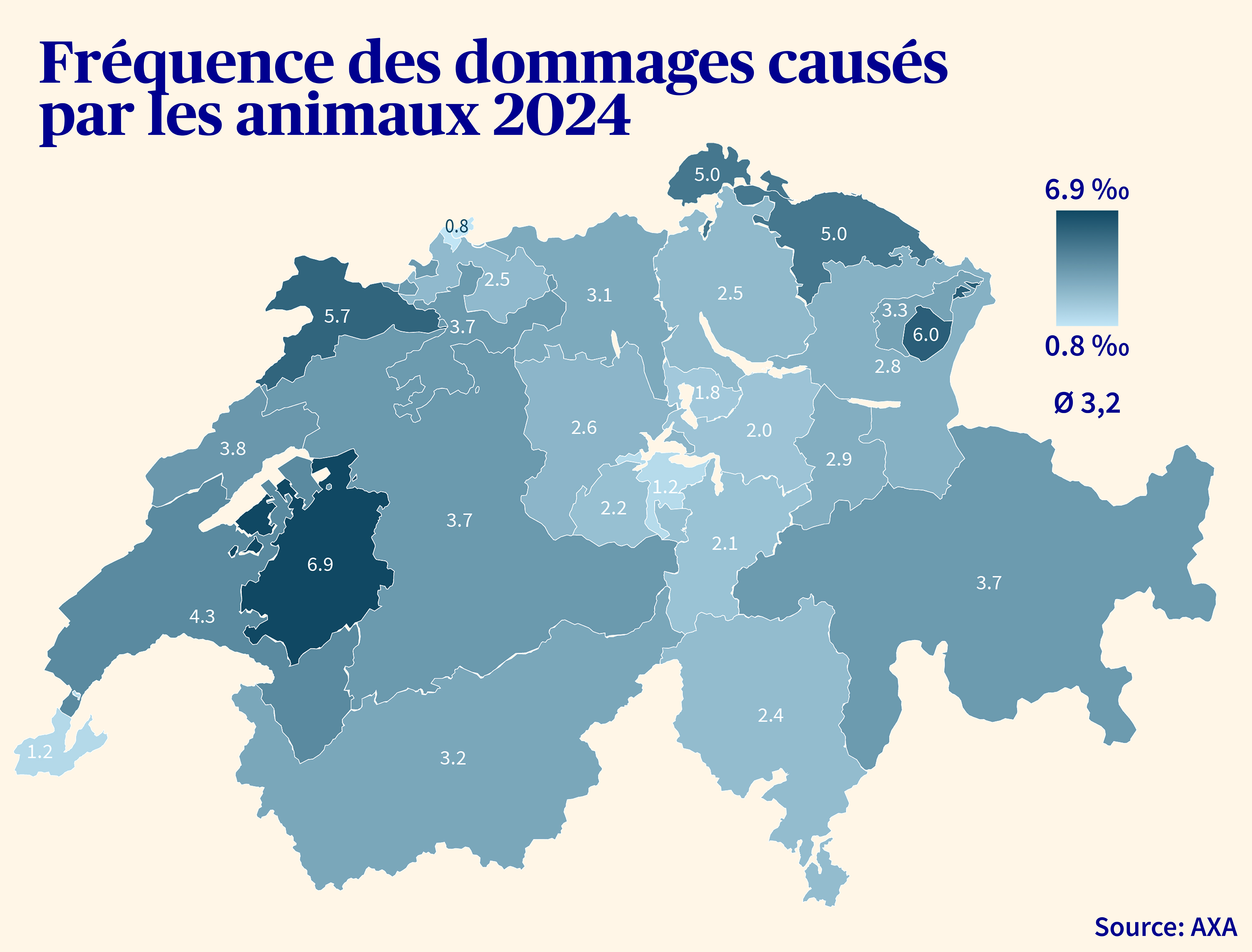 L’année dernière, AXA a dépensé plus de 11,5 millions de francs pour les accidents avec des animaux sauvages. Actuellement, un sinistre coûte près de 3800 francs. Le risque de collision avec des animaux est particulièrement élevé dans les cantons de Fribourg, du Jura, de Thurgovie et de Schaffhouse.