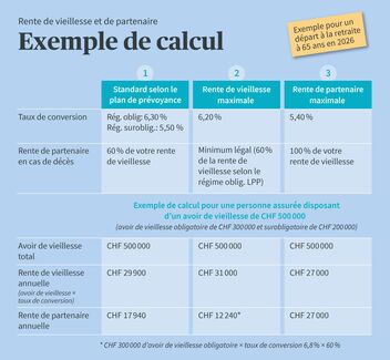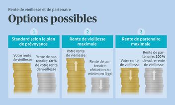 Lorsque vous prenez votre retraite, vous pouvez décider sous quelle forme vous souhaitez percevoir vos prestations de vieillesse du 2e pilier, c’est-à-dire de votre caisse de pension. Vous avez le choix entre un versement en capital, une rente de vieillesse viagère ou une forme mixte. Si vous optez pour une rente de vieillesse, une rente de partenaire équivalant à 60% est généralement assurée et versée en cas de décès, conformément aux dispositions du règlement de prévoyance.