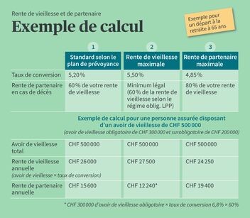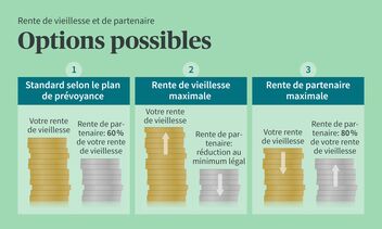 Lorsque vous prenez votre retraite, vous pouvez décider sous quelle forme vous souhaitez percevoir vos prestations de vieillesse du 2e pilier, c’est-à-dire de votre caisse de pension. Vous avez le choix entre un versement en capital, une rente de vieillesse viagère ou une forme mixte. Si vous optez pour une rente de vieillesse, une rente de partenaire équivalant à 60% est généralement assurée et versée en cas de décès, conformément aux dispositions du règlement de prévoyance.