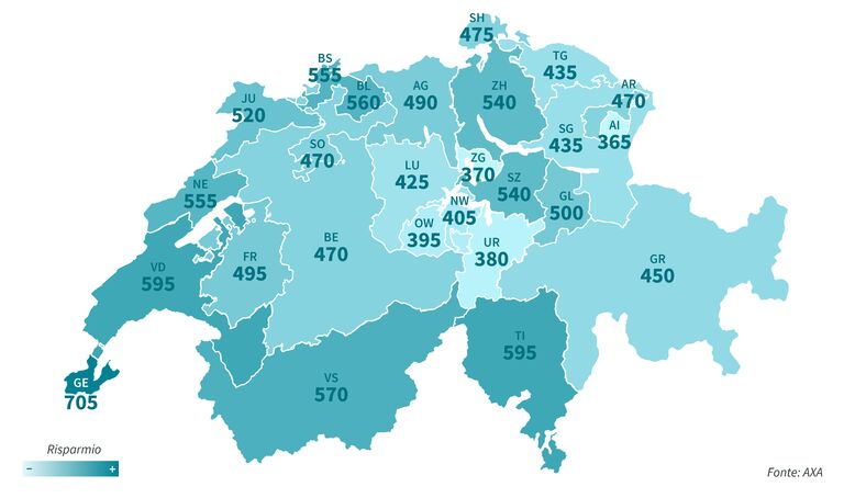 *La base per il calcolo del potenziale di risparmio medio per il 2026 è stata costituita dai cambi dell’assicurazione di base effettuati tramite il servizio cambio AXA che hanno portato a un risparmio, al netto degli adeguamenti cantonali medi dei premi comunicati dall’UFSP per il 2026. I calcoli evidenziano un risparmio arrotondato a cinque franchi e si basano sul valore medio dei cambi degli ultimi tre anni.