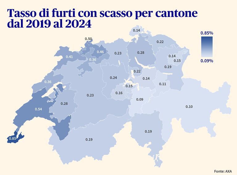Le probabilità di un furto con scasso non dipendono solo dalla stagione, ma anche da dove si abita. Dal 2019, ad esempio, nel Cantone di Ginevra il rischio di effrazione è più che raddoppiato rispetto alla media svizzera, con 8,5 casi all’anno ogni 1000 economie domestiche. Anche i cantoni Vaud, Basilea Città, Basilea Campagna, Giura, Soletta e Neuchâtel hanno registrato un numero di effrazioni superiore alla media. Situazione opposta nella Svizzera centrale e sudorientale, dove tali disavventure accadono molto raramente: dal 2019 nei Grigioni, a Uri e Glarona si sono verificati rispettivamente 1, 0,9 e 1,1 furti con scasso all’anno ogni 1000 economie domestiche. La media svizzera è di 3,2.