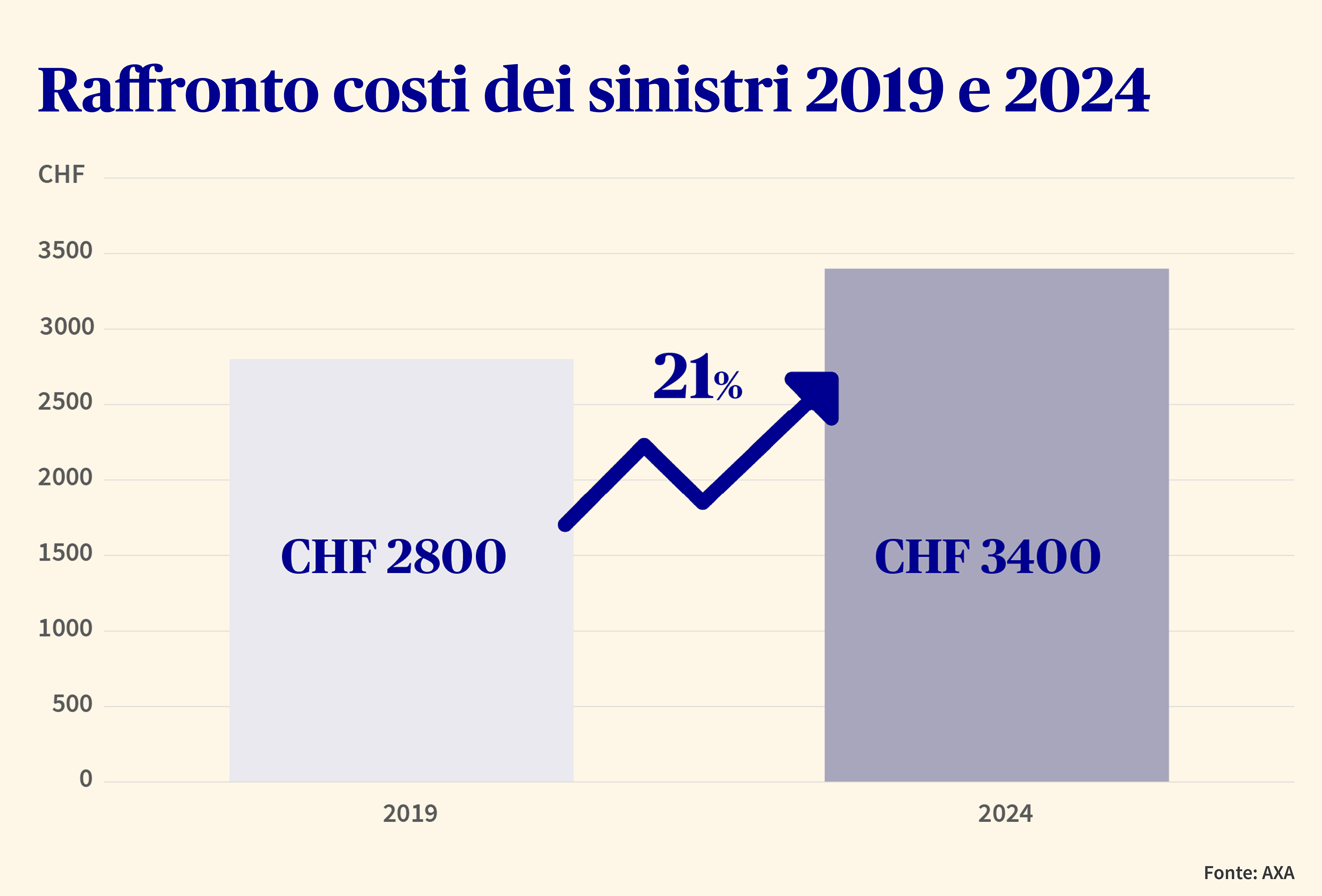 I costi per i sinistri riguardanti i veicoli a motore sono notevolmente aumentati. Nel 2024 presso AXA l’ammontare medio dei danni da collisione è stato di quasi 3400 franchi, oltre un quinto in più rispetto a cinque anni fa.